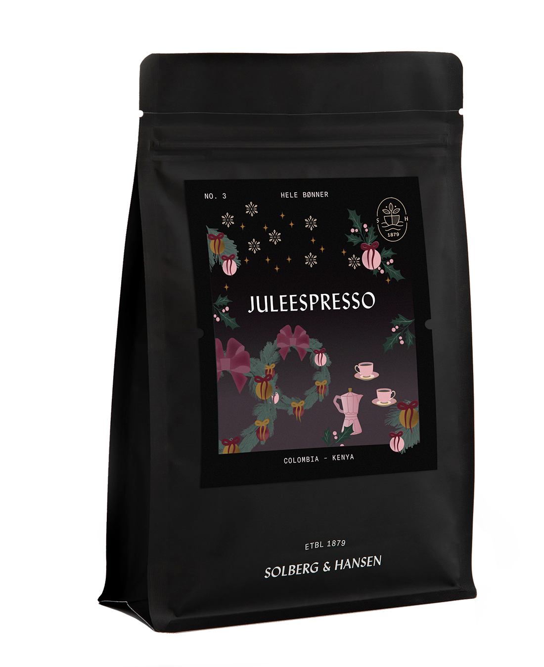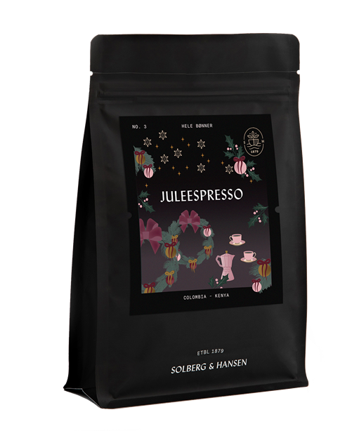 Årets juleespresso er en espressoblanding med våtforedlet kaffe fra Tolima i Colombia og Muranga i Kenya. Juleespressoen smaker nydelig på espressomaskin og mokkakanne, og den kan også brukes på presskanne eller som kokekaffe.
