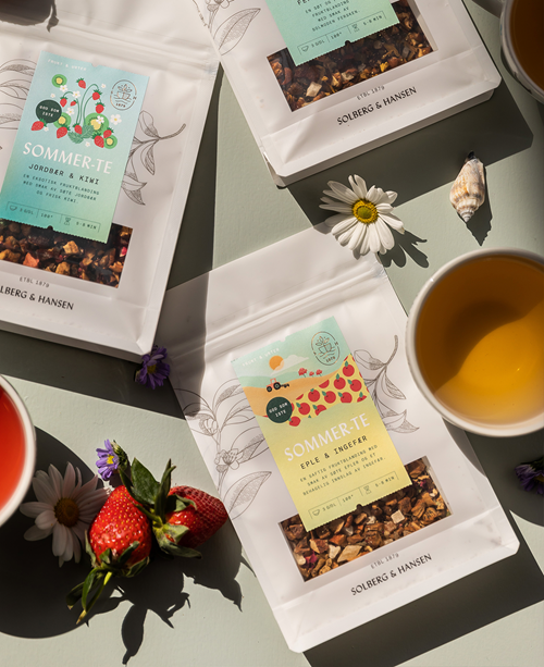 Ingredienser: eplebiter, papayabiter (papaya, sukker), carobbiter, ingefær, aroma, bjørnebærblader, solbærblader, roseblader.
