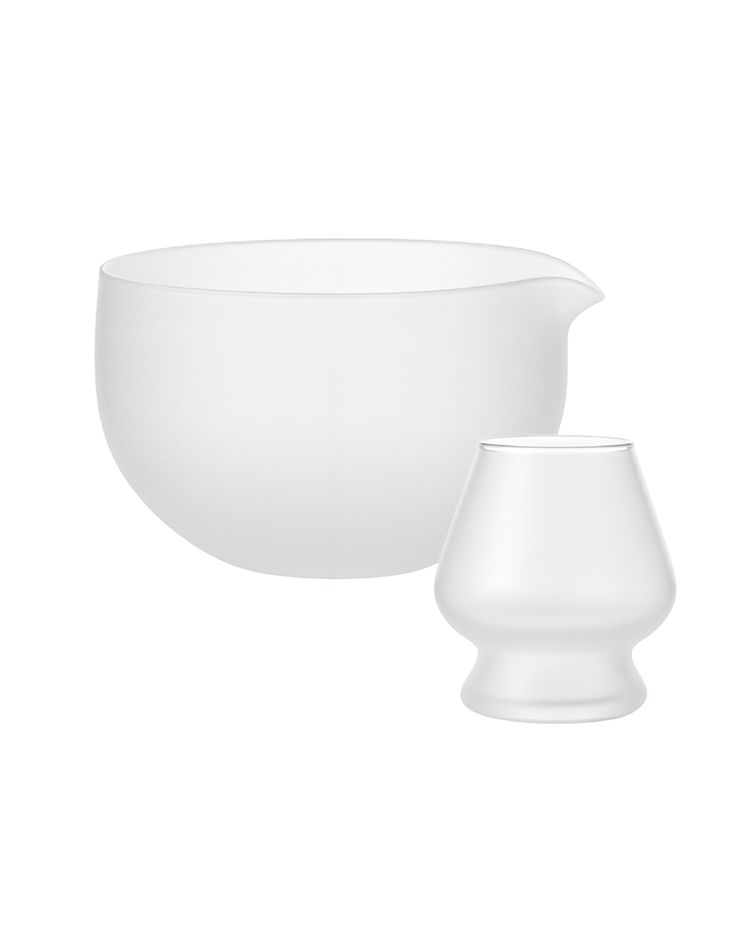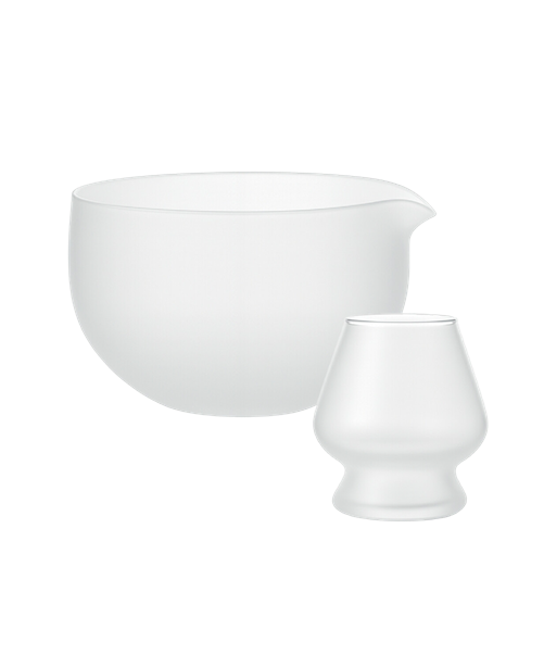 Matcha-sett i minimalistisk, frostet glass med matcha-bolle og visp-holder. Settet er spesielt beregnet for brygging av matcha. Skålen har helletut, og rommer 400 ml.