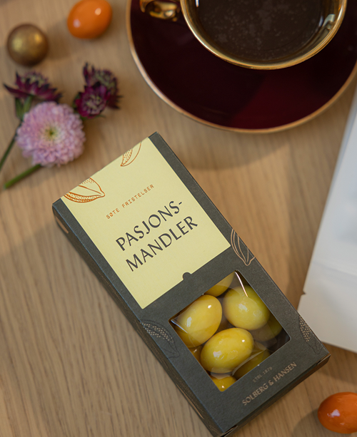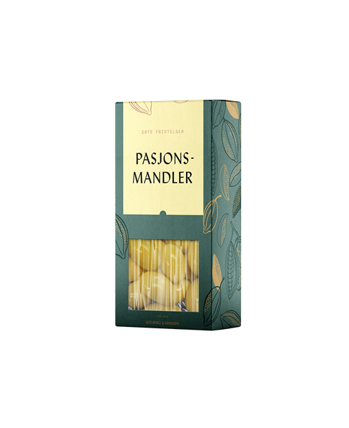 Sprø mandler drasjert i fløyelsmyk hvit sjokolade med en frisk, tropisk smak av pasjonsfrukt.